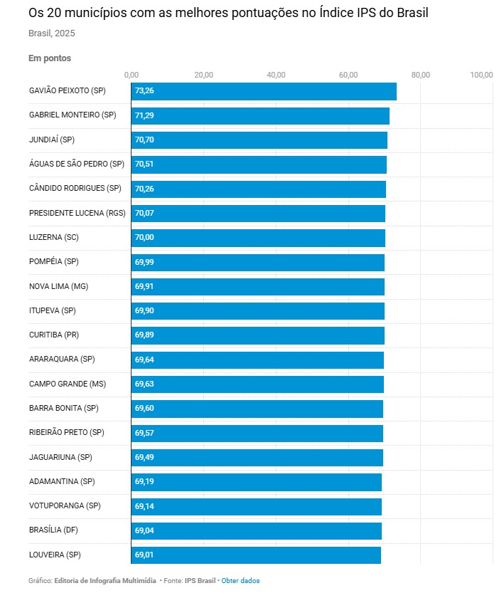 A liderança ficou novamente com o pequeno município de Gavião Peixoto (SP), que alcançou 73,6 pontos em uma escala de 0 a 100. É o segundo ano consecutivo que a cidade encabeça o ranking nacional.
