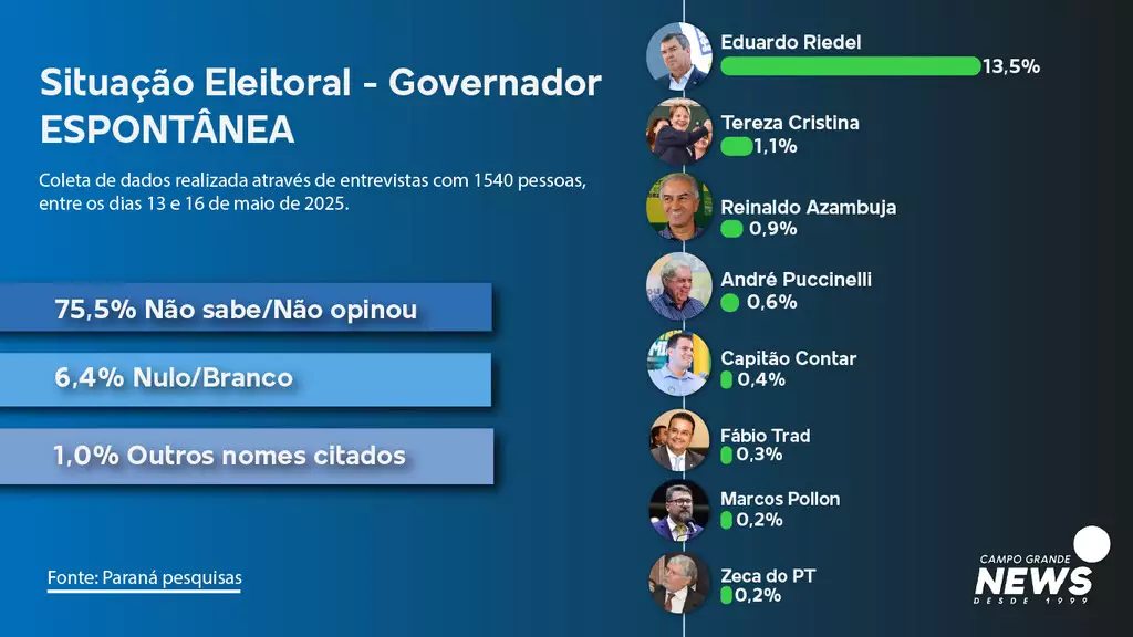 No entanto, Riedel é o nome mais lembrado, com 13,5%, seguido de Tereza Cristina (1,1%) e Reinaldo Azambuja (0,9%). Brancos e nulos foram opção para 6,4% dos entrevistados.