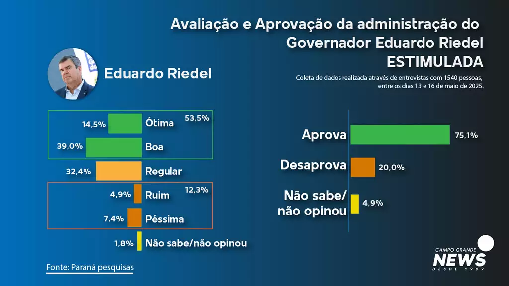 Avaliação do governador – O Instituto Paraná também questionou os eleitores sobre o desempenho do governo tucano. A administração do governador Eduardo Riedel (PSDB) é aprovada por 3 a cada 4 eleitores de Mato Grosso do Sul. A taxa de aprovação chega a 75,1%, enquanto 20% dizem desaprovar a atual gestão e 4,9% não sabem ou preferem não opinar.