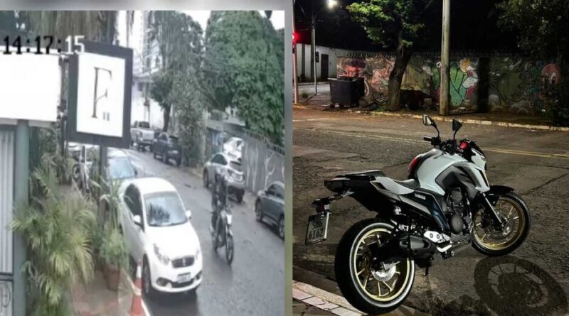 Câmeras de monitoramento registraram a ação dos suspeitos, descritos como um casal, saindo com a motocicleta do local.